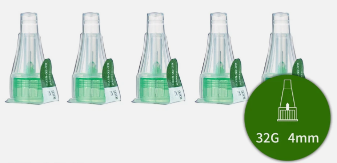 • Precision, Super fine gauge (32G) with a short 4mm tip and colour-coded hub for instant identification